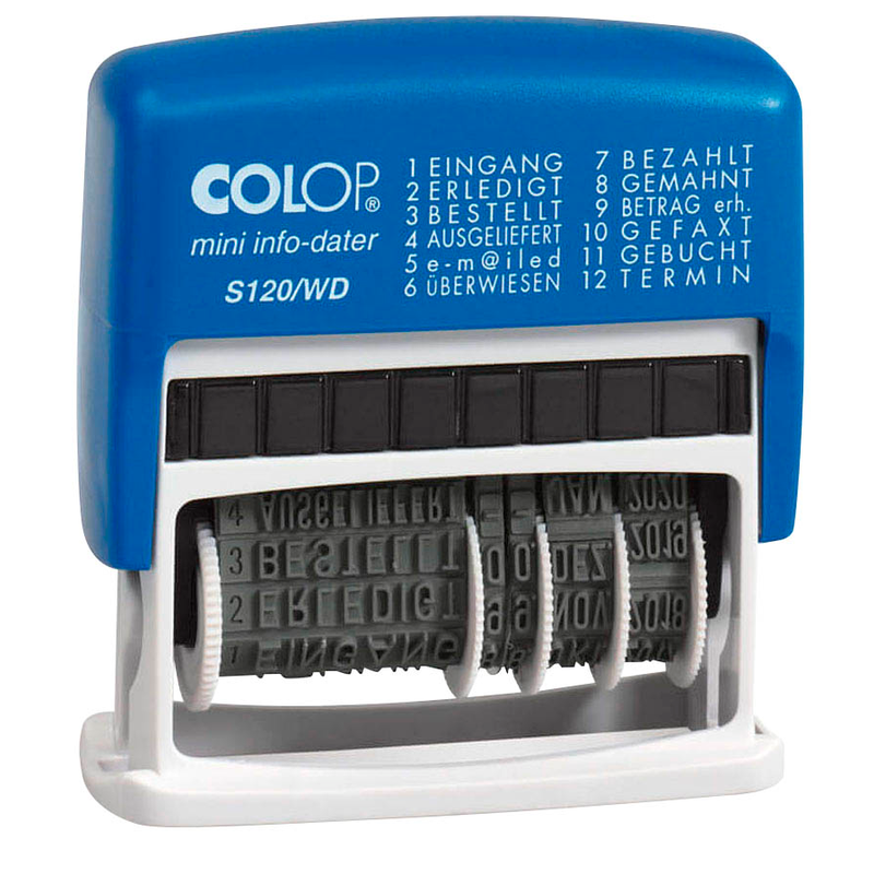 Mit dem COLOP Datumstempel mit Text Mini-Info-Dater S120/WD selbstfärbend blau rot ohne Logo, 1 St. dokumentenecht stempeln
