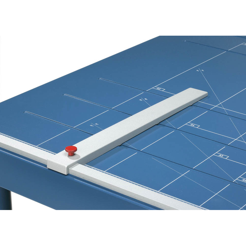 Eigenschaften stabiler Metalltisch, rutschfeste Gummifüße, Formatlinien, robuster Handgriff, verstellbarer Metall-Rückanschlag, Zwei Winkelanlagen mit mm-Skala für einen exakten 90°-Schnitt, Obermesser aus Solinger Stahl, geschliffen und gehärtet – nachschleifbar, verschraubtes Untermesser aus Solinger Stahl, geschliffen und gehärtet, abschließbar