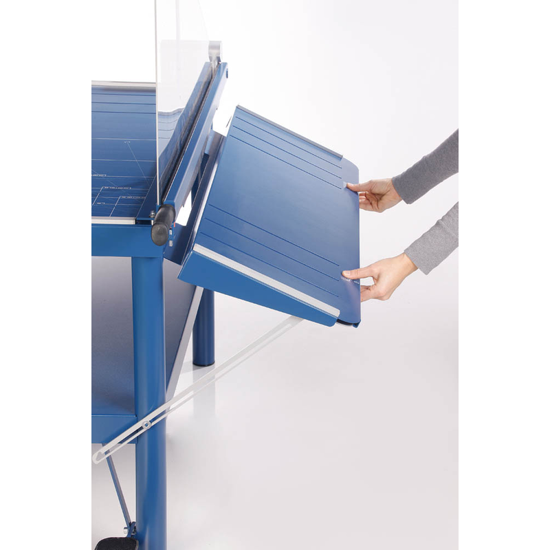 Wenn Sie den DAHLE Hebelschneider 580 bestellen, erhalten Sie die Lieferung inklusive Untergestell, Fußpressung, ausklappbarer Seitentisch und Werkstoffmesser.