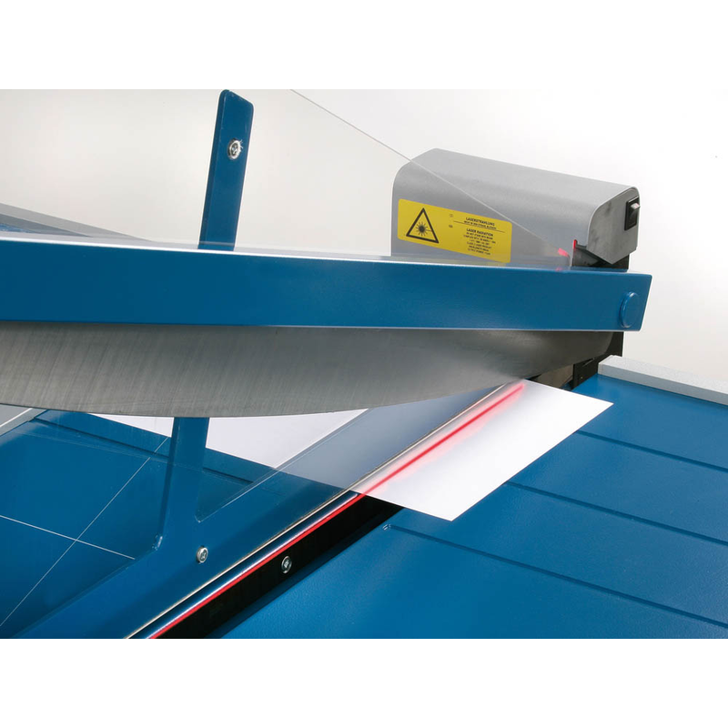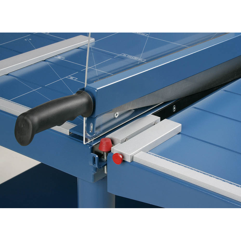 Ausführung hochwertige, nachschleifbare Stahlmesser aus Solingen; komfortable Fußpressung für gleichmäßiges Anpressen von großformatigem Schnittgut; klappbarer Vordertisch mit Führungsnuten; fest verbundenes Untergestell mit Ablageboden für eine Arbeitshöhe von 74 cm