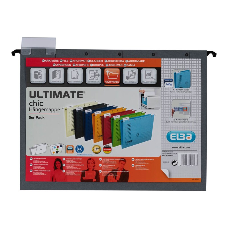 Die ELBA Hängemappen chic ULTIMATE anthrazit, 5 St. bringen Struktur in Ihre Unterlagen, damit Sie schnell auf die benötigten Dokumente zurückgreifen können.