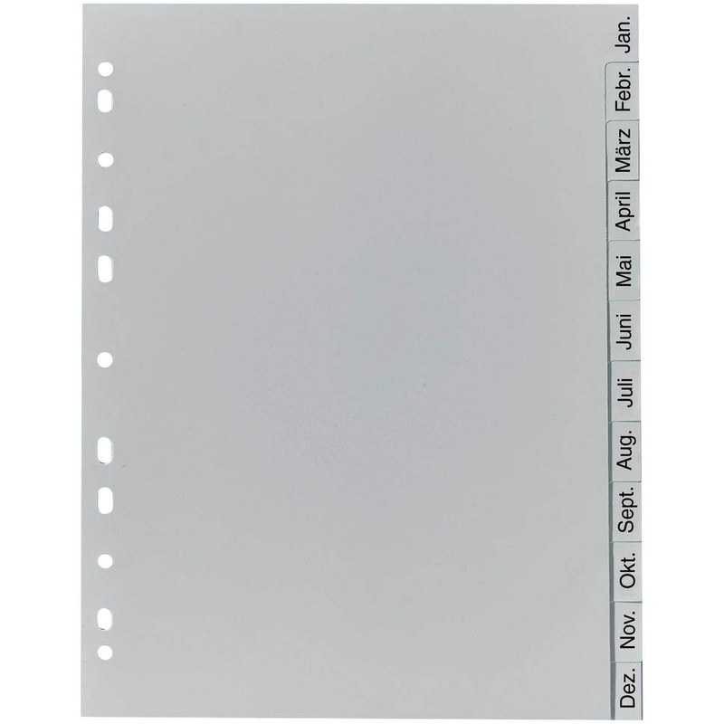 Die beschriftbaren Exacompta Ordnerregister im Vollformat mit Überbreite sind einfach unverzichtbar, um Unterlagen und Papiere in Aktenordnern, Ringbüchern oder Schnellheftern übersichtlich aufzubewahren und schnell wiederzufinden. Auch Sie wollen den Überblick über eine große Menge von Dokumenten im DIN A4-Format behalten? Kein Problem mit dem grauen Exacompta Monats-Register aus robustem Polypropylen (PP) mit einer Folienstärke von 130 µm und Universal-Lochung. Ein Satz enthält 12 Kunststoff-Folien mit bedruckten Taben Jan.-Dez. , die das Ordnen und Archivieren von Rechnungen, Formularen, Briefen und vielen anderen Unterlagen durch numerisches Unterteilen enorm vereinfachen.