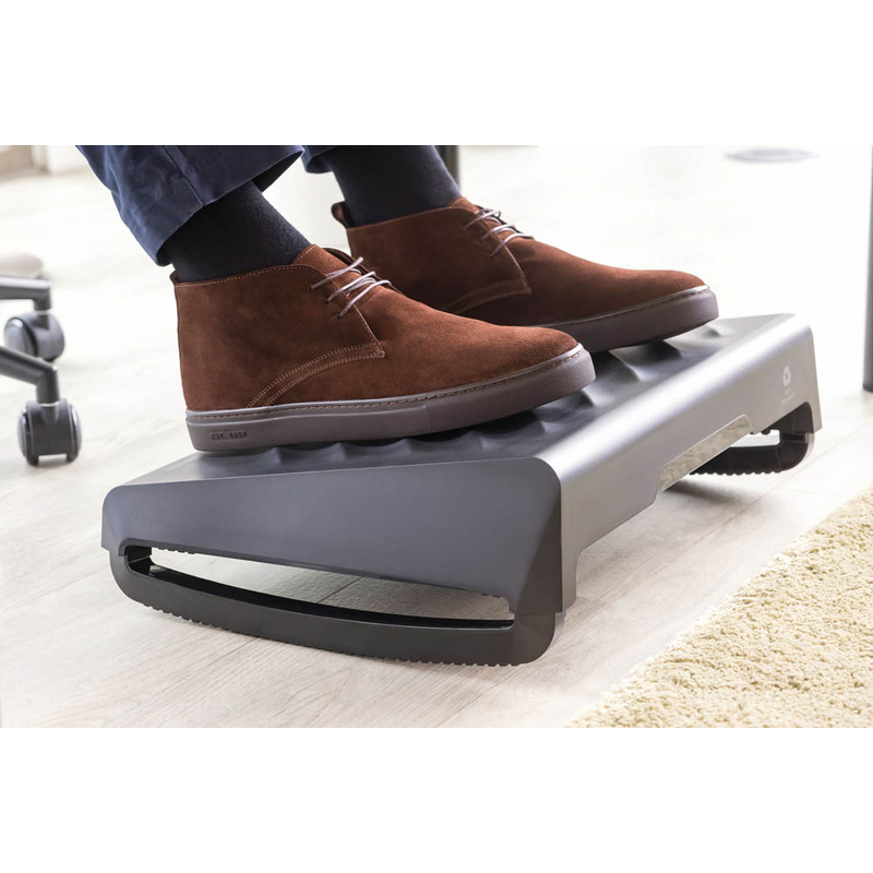 Das moderne und schlichte Design der Fußstütze ist in den zeitlosen Farben Schwarz und Weiß erhältlich und fügt sich nahtlos in jede Büroumgebung ein. Die Fußstütze ist zu 100 % recycelbar und steht für Langlebigkeit.