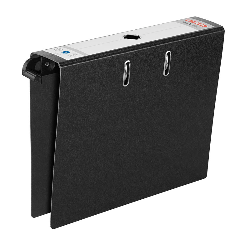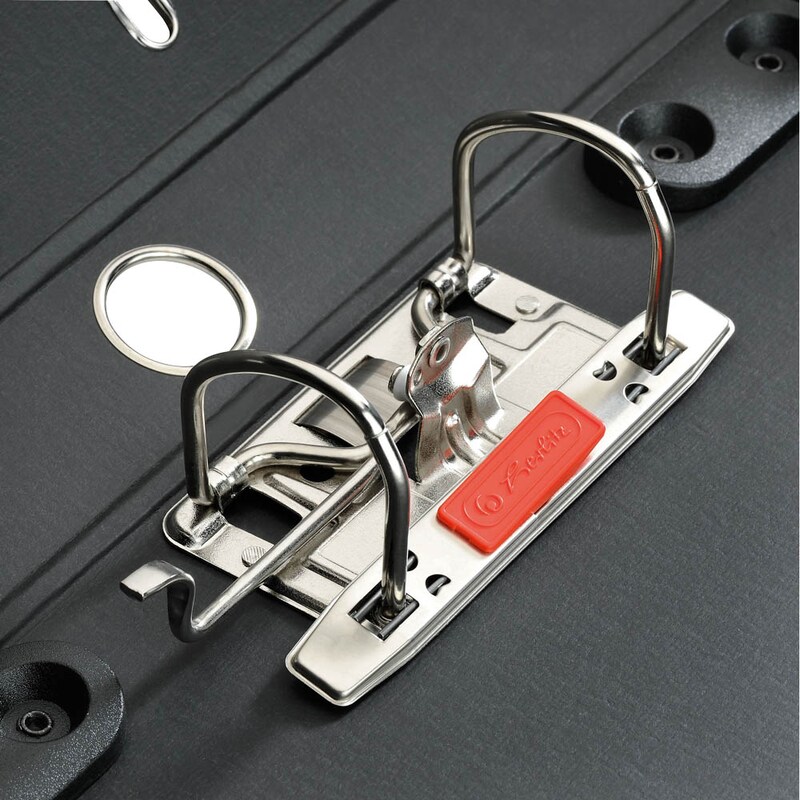 Der schwarze Karton-Ordner in Lederprägung-Optik ist mit einer Präzisions-Hebelmechanik, einem Griffloch, Raumsparschlitzen und einem aufgeklebtem Rückenschild bestens ausgestattet.