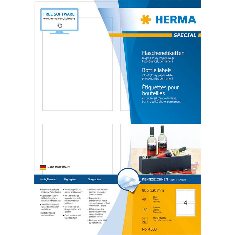 Die HERMA Flaschenetiketten bieten folgende besonderen Eigenschaften: Glossy Papier in Premium-Foto-Qualität, lichtecht, kältebeständigt.