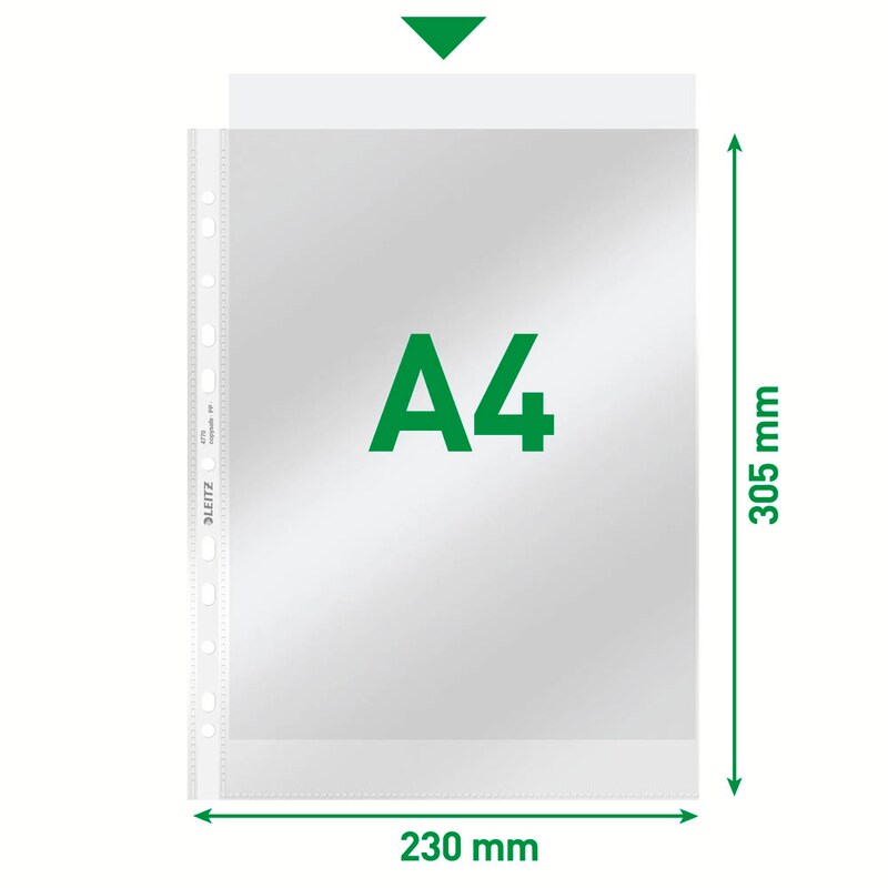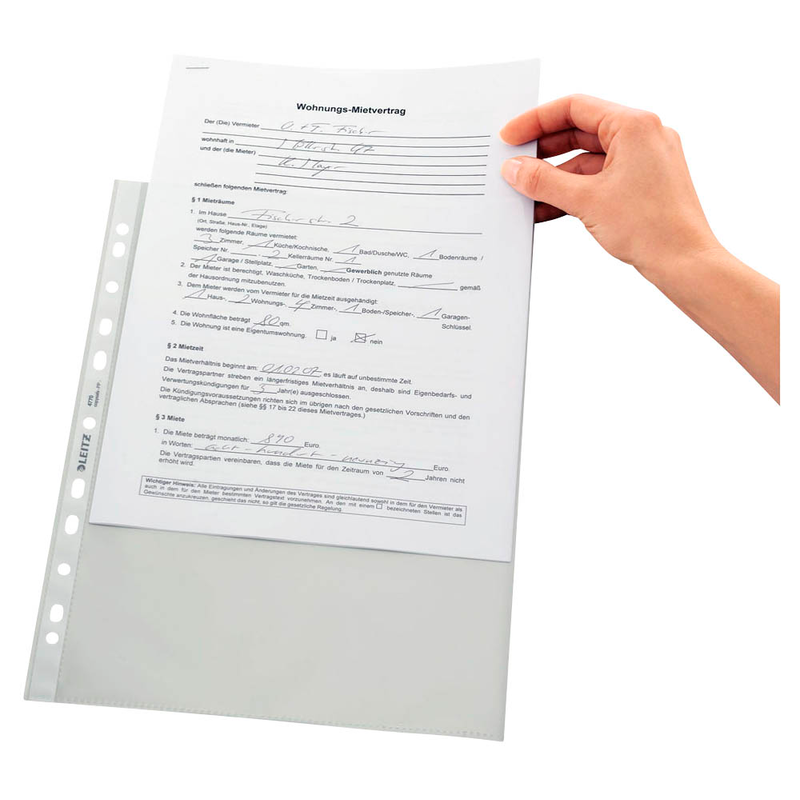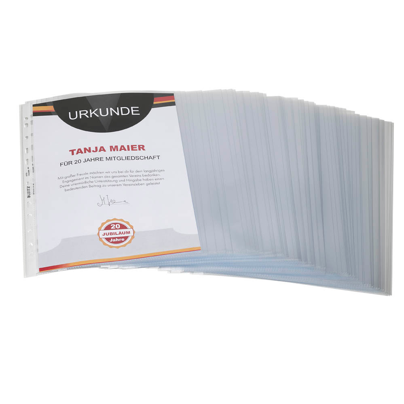 Die Öffnung (oben) ermöglicht es, den Inhalt sofort zu entnehmen. Dank der praktischen Universal-Lochung können die Hüllen problemlos abgelegt werden, sodass Ihre Dokumente stets sicher und ordentlich verstaut sind – unabhängig vom Ablagesystem. Die glatte Oberfläche sorgt für ein elegantes Erscheinungsbild und ermöglicht eine mühelose Reinigung.
