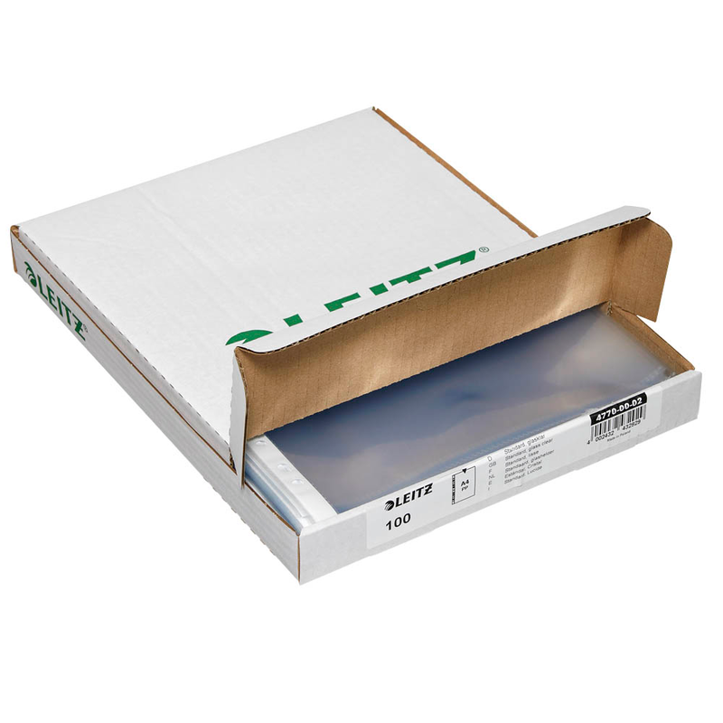 Die LEITZ Prospekthüllen 4770 DIN A4 glasklar glatt 0,08 mm, 100 St. schützen Ihre Papiere vor äußeren Einflüssen und sorgen für eine übersichtliche Ablage. Sie sind die ideale Wahl, um wichtige Dokumente sicher und strukturiert zu verwahren. Diese Eigenschaft besitzen die Produkte: Standard.