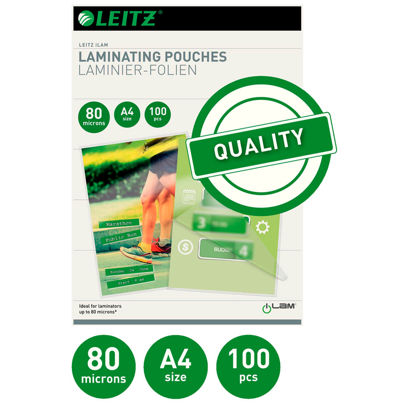 Schützen Sie wichtige Unterlagen durch eine professionelle Lamination mit den LEITZ Laminierfolien glänzend für A4 80 micron, 100 St.. Sie sind optimal für alles, was sehr oft und hoch beansprucht wird, wie z.B. Bekanntmachungen, Präsentationsmaterialien, Preislisten oder Hinweisschilder. Egal von welcher Marke Ihr Gerät ist, wenn es für die Heißlamination ausgestattet ist, ist es ein idealer Partner für diese Folien.