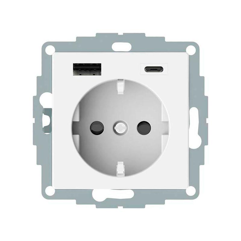 Diese besonderen Eigenschaften stecken in der MERTEN Steckdose mit USB-Anschluss: mit integrierter USB-A und USB-C Ladefunktion, mit Federklemmen.