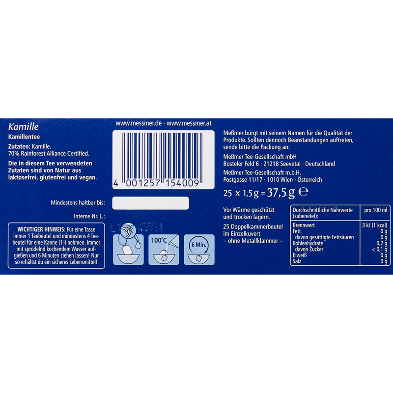 Die Beutel sind für die Zubereitung in der Tasse konzipiert, wodurch der MEßMER KAMILLE TEE schnell und einfach zubereitet werden kann. Um das beste Geschmackserlebnis zu bewahren, sollte er trocken und vor Wärme geschützt gelagert werden.
