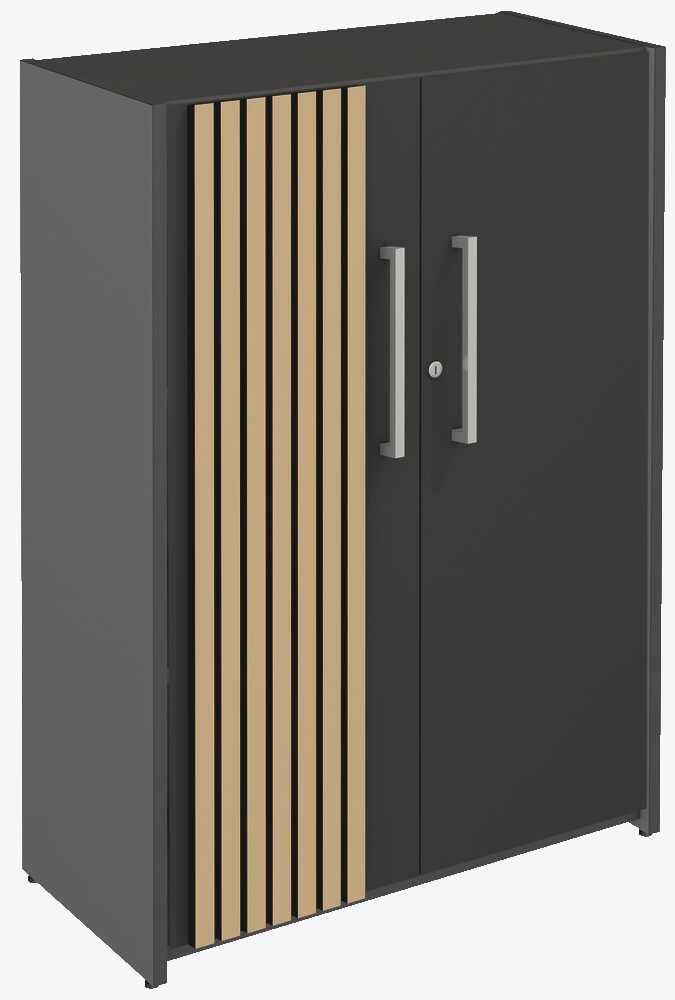 Die Serie umfasst abschließbare Schränke mit hochwertigen Edelstahl-Bügelgriffen sowie verstellbaren Sockelfüßen für einen sicheren Stand. Türen mit geräuschdämpfender Paneel-Applikation aus Filz und hellen Eichenholzstreifen tragen dazu bei, Schall effektiv zu reduzieren und die Raumakustik spürbar zu verbessern – ideal für konzentriertes Arbeiten in modernen Büroumgebungen.