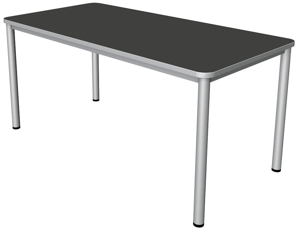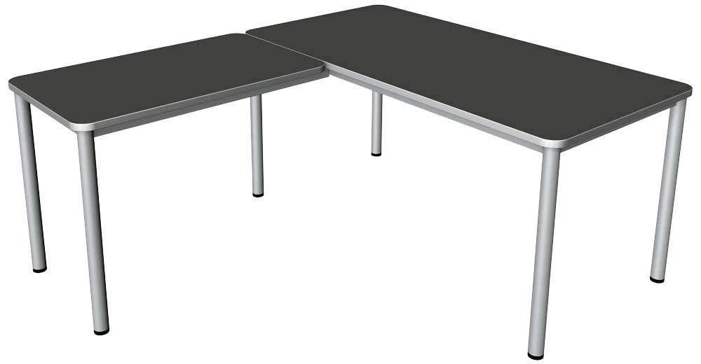 Ästhetische Schreibtische mit 4-Fuß-Gestell in Stahl, silber. Die gerundeten Tischplatten bieten in Kombination mit den runden Tischbeinen ein harmonisches Gesamtbild. Die abgerundeten Ecken bieten zudem Stoßsicherheit.