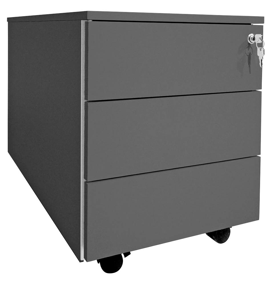 Die Tischplatten mit Melaminharzbeschichtung verfügen über eine stilvolle Silberkante. Die Türen sind mit massiven Edelstahl-Griffen versehen.