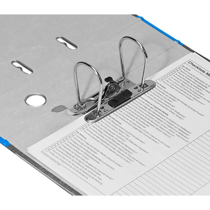 Dank der belastbaren Qualitäts-Hebelmechanik hält der Organisationshelfer auch hohen Beanspruchungen stand. Durch die leichte Handhabung wird das Füllen, Entnehmen oder Austauschen von Blättern zum Kinderspiel. Die Bügel der Hebelmechanik können auch sehr viel Füllmaterial mit Leichtigkeit festhalten.Der Abstand zwischen den Bügeln beträgt 80 mm. Dabei kann jedes üblich gelochte Dokument abgeheftet werden. Eine platzsparende Aufbewahrung garantieren die Raumsparschlitze. Das sind die kleinen metallummantelten Spalten im Ordnerdeckel, die auch ein ungewolltes Aufklappen verhindern.