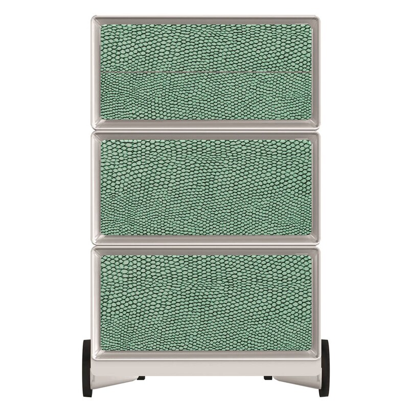 Die Griffleisten sind fast unsichtbar. So lässt sich das Möbelstück leicht öffnen und es gibt keine störenden Elemente, die das besondere Design optisch verändern. Die Griffe bestehen aus Kunststoff. Diese Ausstattungsmerkmale hat das Exemplar zudem: Mit 4 Rollen, davon 2 multidirektional. 2 Doppelschubladen Nutzmaß: 32,5 x 40,5 x 6,0 cm und 2 horizontale Schubladen Nutzmaß: 32,5 x 40,5 x 13.3 cm (BxTxH).
