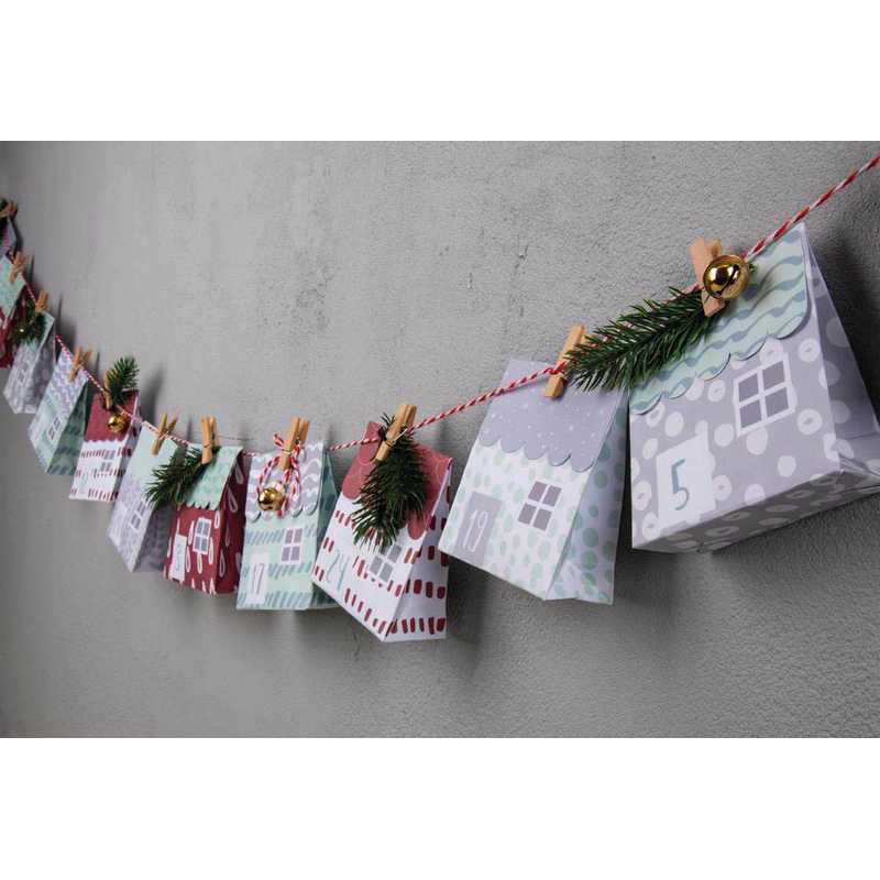 | Set-Inhalt 1 | 24 Papier-Häuser, 9 x 10 cm, Bodentiefe 3,5 cm, 24 Holz-Wäscheklammern, 2 cm und ca. 3 m Kordel weiß/rot |