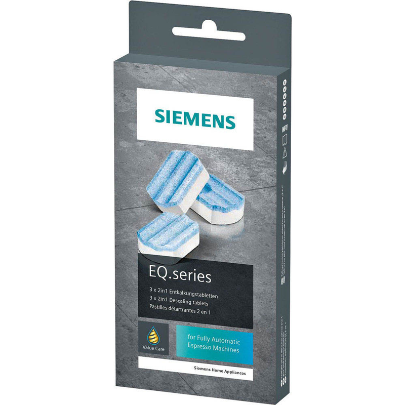 Die Einsatzbereiche der SIEMENS Entkalkungstabletten TZ80002A sind Kaffeevollautomaten. Speziell konzipiert wurde der Artikel für Siemens Kaffeevollautomaten EQ Serie. Sie erhalten das Produkt mit einem Inhalt von 3 Tabletten.