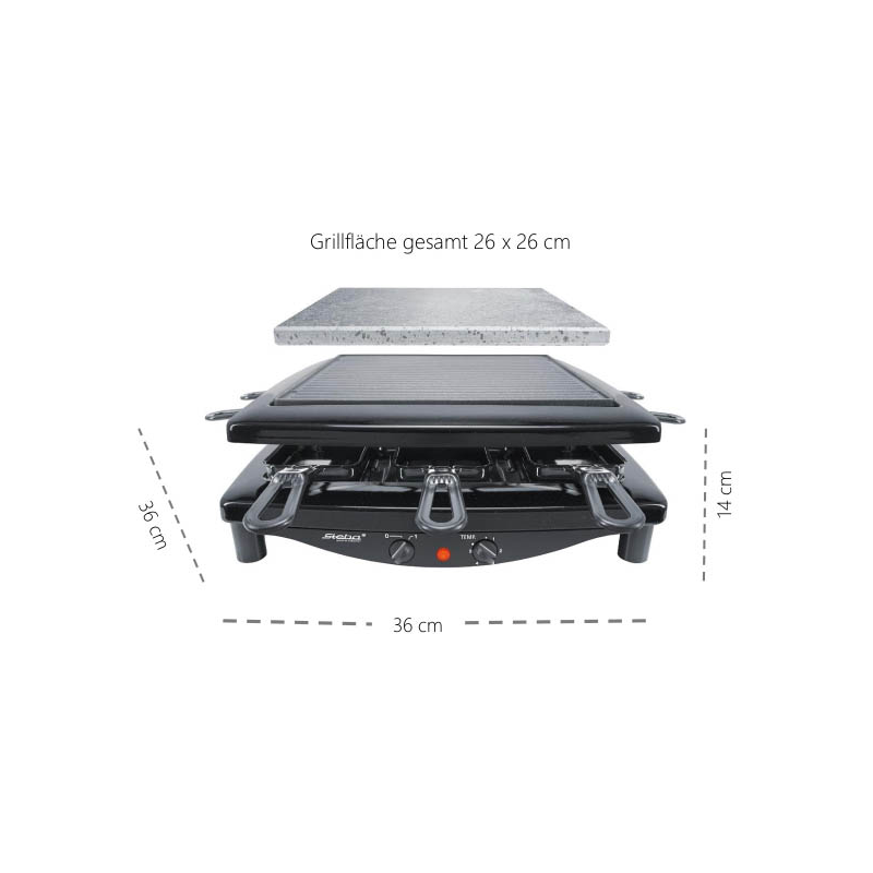| Lieferung inkl. | 8 emaillierte Pfännchen, emaillierte Gusseisen-Grillplatte (wendbar, geriffelt/glatt), Natursteingrillplatte |