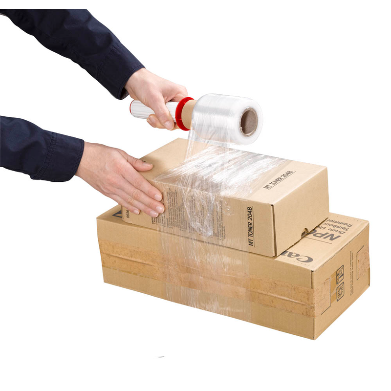 Der vielseitig einsetzbare Handabroller von Stretchplus mit schmaler Stretchfolien-Rolle eignet sich ideal zum Fixieren von Zubehörteilen oder zum Verschließen kleinerer Verpackungen.