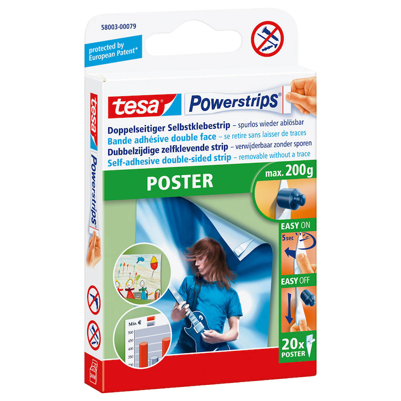 Die doppelseitigen Powerstrips POSTER von tesa machen ein leichtes und schnelles Befestigen von Papieren aller Art an der Wand, im Ordner oder im Album möglich.