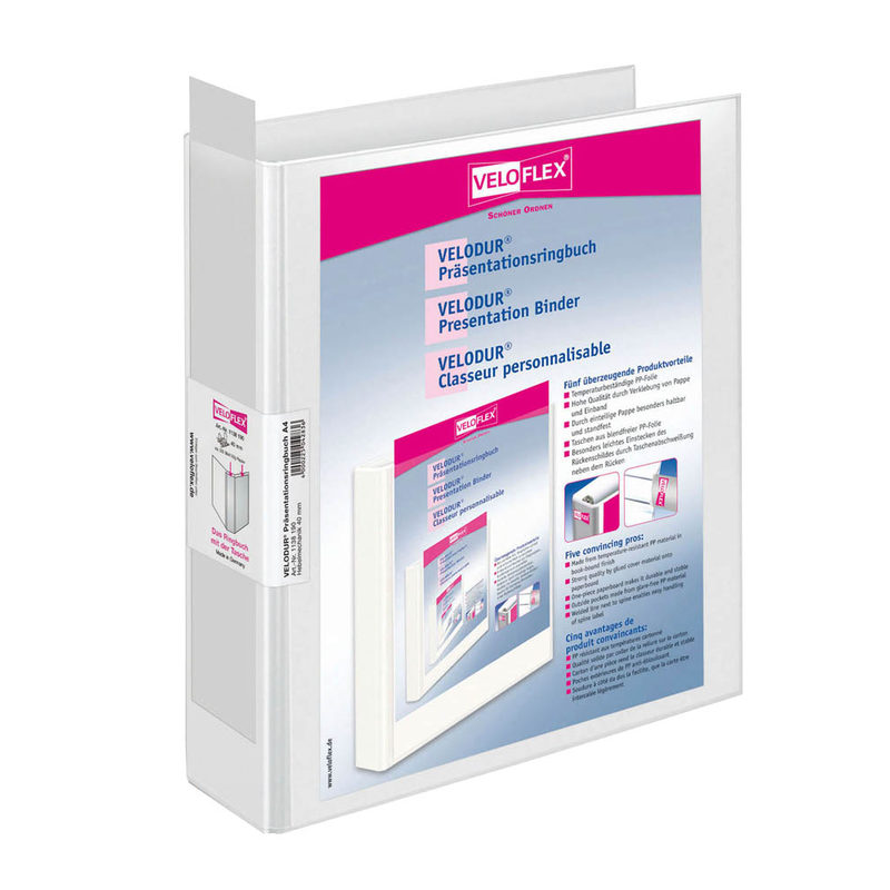 Der VELOFLEX VELODUR® Präsentationsordner weiß Kunststoff 6,5 cm DIN A4, 1 St. sind für die unterschiedlichsten Einsatzzwecke sehr praktisch. Sie können darin z.B. wichtige Inhalte für Kunden ansprechend aufbereiten und zeigen.