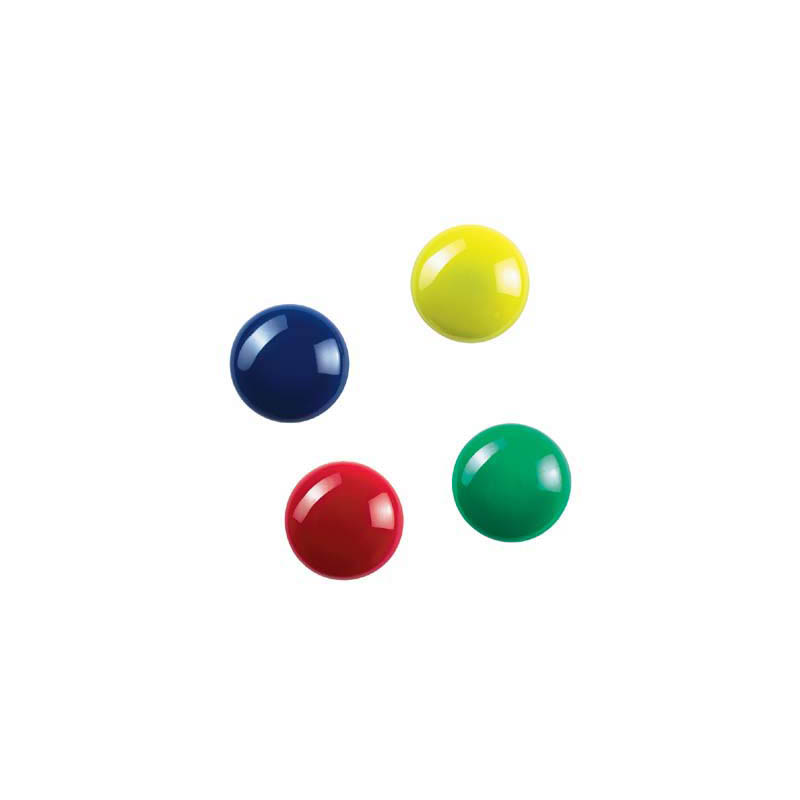 Bei einer Präsentation oder Unterrichtsgestaltung erweisen sich Haftmagnete als unverzichtbare Helfer. 12 farbsortierte Magnete (je 3x rot, blau, gelb, grün) auf einen Streich erhalten Sie hier pro bestelltem Pack. Ideal für den Einsatz am Whiteboard sind die Magnete dank gut greifbarer Kunststoff-Kappe immer schnell zur Hand. Mit einer Größe von Ø 2,0 x 0,9 cm haften die runden Magnete nicht nur auf Whiteboards, sondern auch auf Jahresplanern, Magnettafeln und Magnetbändern. Somit sind Sie für den vielfältigen Einsatz sowohl im Büro als auch fürs Zuhause bestens geeignet.